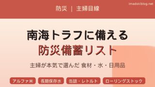 南海トラフ地震に備えて主婦が本気で選んだ防災備蓄リストを紹介。水・アルファ米・缶詰・レトルトなど、家族を守るために本当に必要な食材と日用品を厳選。ローリングストックのコツも解説します。